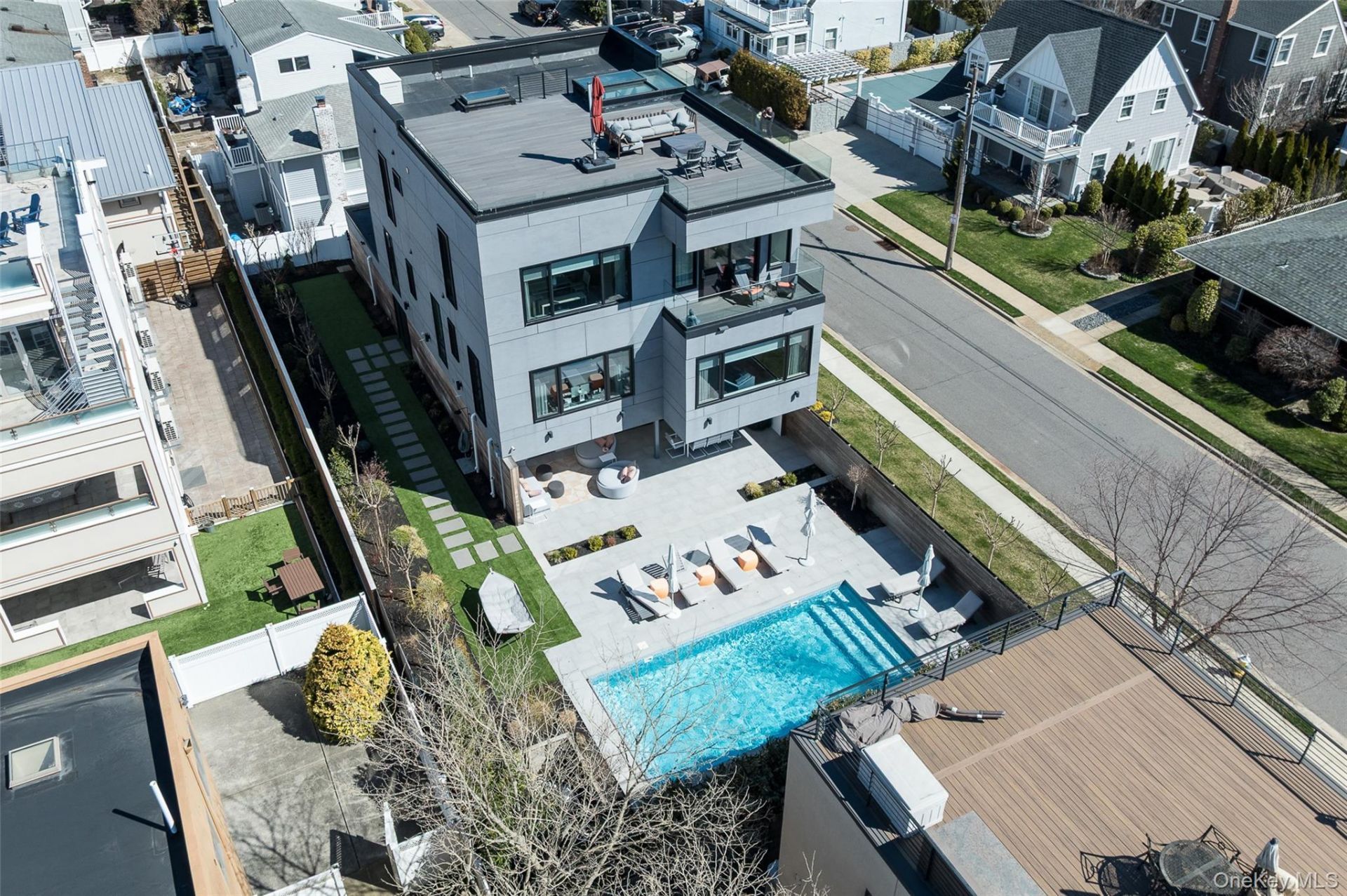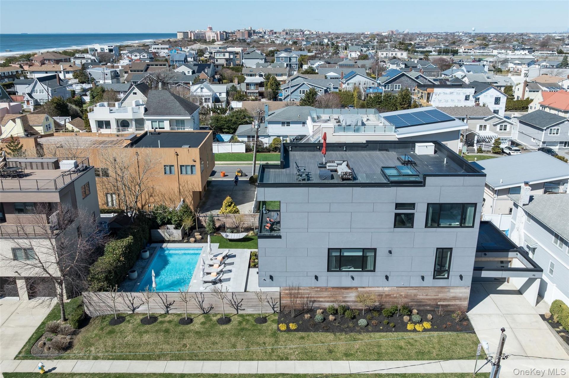 Experience unparalleled luxury in this custom modern estate, perfectly situated just 450 feet from the shoreline in exclusive Lido Dunes. This elevated retreat is masterfully constructed for coastal durability, featuring a white cedar & Equitone facade, hurricane-rated windows, and 360-degree views of the Atlantic and NYC skyline. Architectural elegance defines the interior, highlighted by custom floating staircases and a private elevator servicing all levels. The main floor offers a state-of-the-art open concept with a gourmet kitchen featuring touch-open Scavolini Cabinets, Thermador and Miele appliances, formal dining area, living room with a fireplace and entry to an oceanview balcony. Each bedroom is a private sanctuary with its own en-suite bath and custom walk-in closets, while the primary suite boasts a spa-inspired steam shower, expansive walk-in closet and a fireplace. Advanced systems, including high-efficiency HVAC & Split Units with blue light technology and a whole-house water filtration system, provide modern comfort and convenience. Outside, the private oasis features a heated saltwater pool, professional landscaping, and a covered porcelain patio. The sprawling rooftop deck serves as the ultimate entertaining space for enjoying year-round panoramic views of the NYC skyline, sunrises and sunsets. This sophisticated home seamlessly blends high-end technology with contemporary coastal design.46 Nantwick St is more than a residence, it is a refined coastal lifestyle experience!